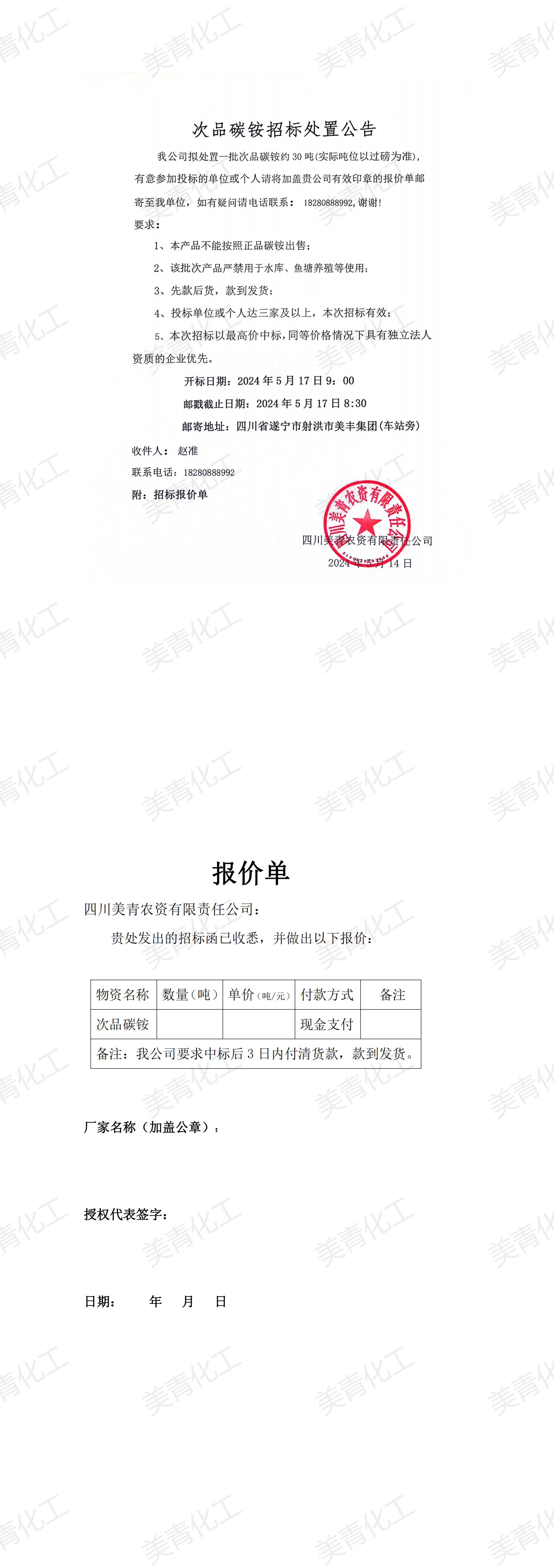 次品碳銨招標(biāo)處置公告