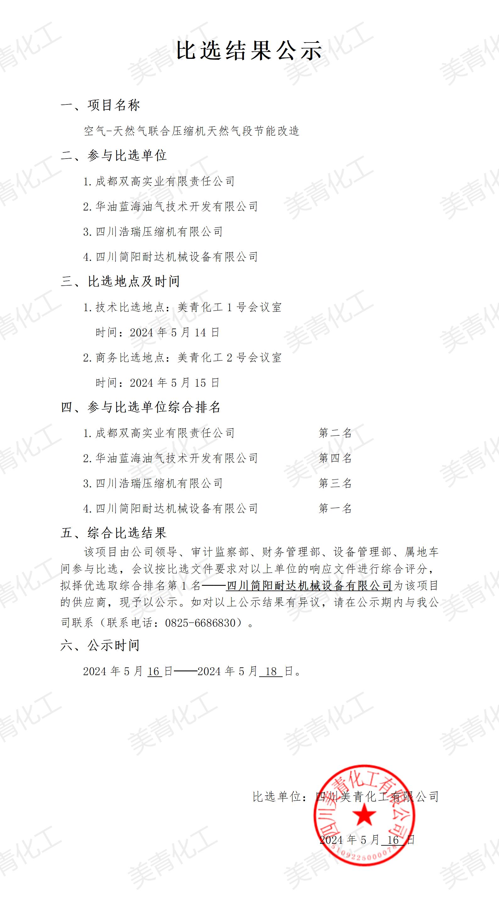 壓縮機(jī)天然氣段節(jié)能改造比選結(jié)果公示